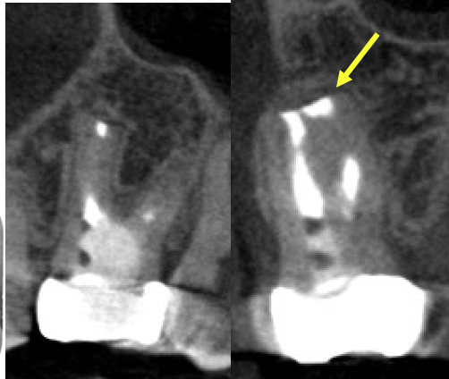 術後1年の経過観察時のCBCT画像。治療前の炎症増は無くなり骨の再生が見られ経過良好です。石灰化MB2の部分に充填がなされていることがわかります(黄色矢印)。このように、感染除去を行って、しっかり封鎖をすることで根管治療を繰り返しても治らない難症例も治癒に導くことが可能です。