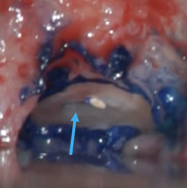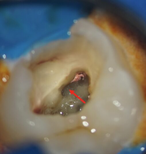 青色の細菌の染め出し液で感染源のイスムスが発覚(青矢印)。根管治療で殺菌が届かない場所です。