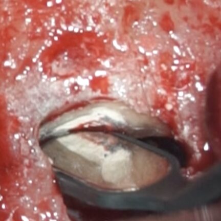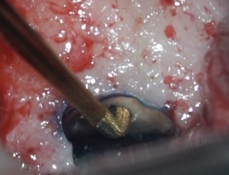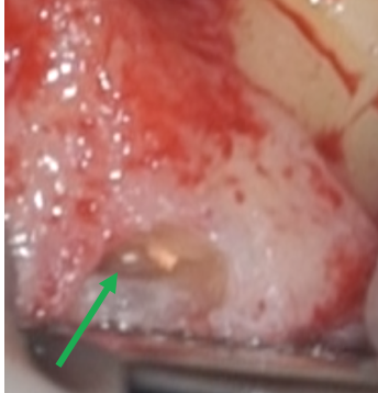 根管治療が効かない状態の歯、原因がいくつかありますがこのケースは根尖孔外感染(細菌が根管ではなく、根管の外の病巣部にコロニーを作って生息しているケース)のため根管治療で根管殺菌後も腫れが改善せず、歯根端切除術で病巣摘出を行い治癒へと導いたケースです。
