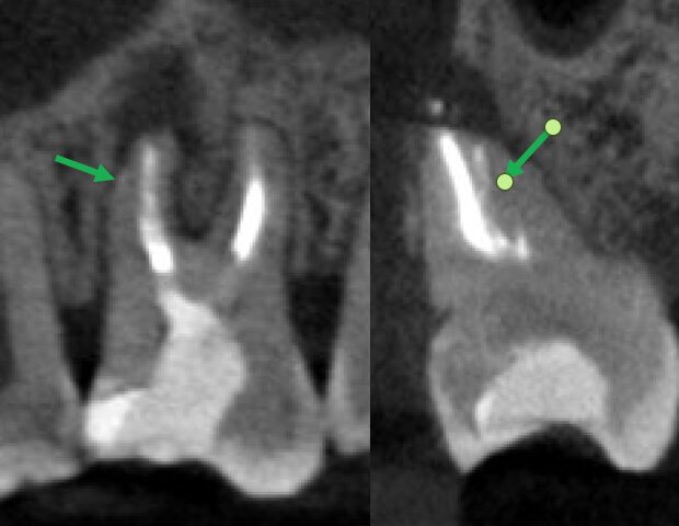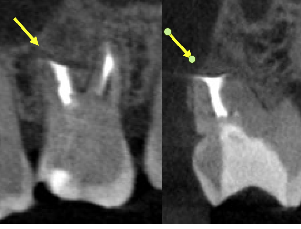 根管治療後一旦腫れが引いたものの、1ヶ月半で再発し歯根端切除術を行うこととなりました。術後のCBCTでは未処置だったMB2に根管充填がなされて殺菌できていることがわかります(緑矢印)。