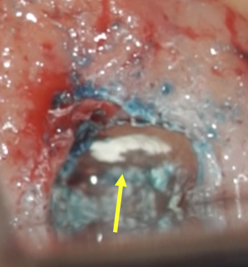 歯根端切除術で摘出した歯根と肉芽組織、黄色い色をした菌塊(細菌のコロニー)が多数見られました(黄色丸内のつぶつぶ)。これが非治癒の原因、根尖孔外に飛び出した感染源です。