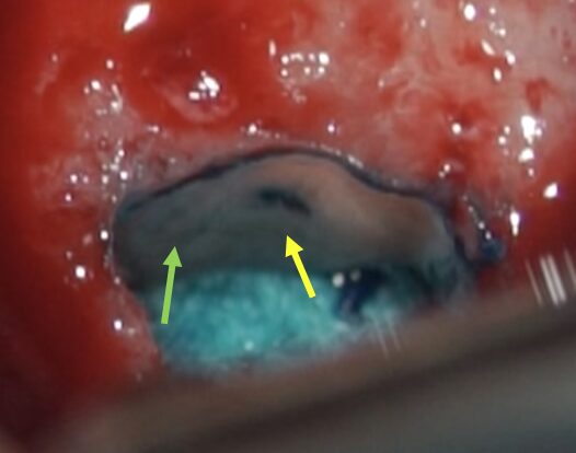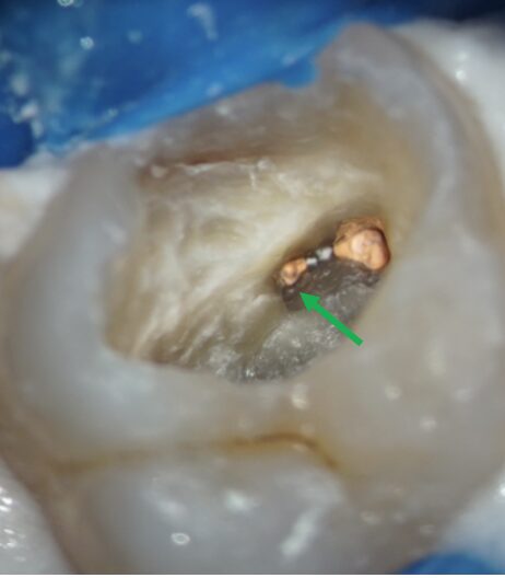 治療時画像、黄色矢印はMB1の根管、緑矢印部がMB2があるであろう場所ですが、根管らしきものは石灰化のため見えません。