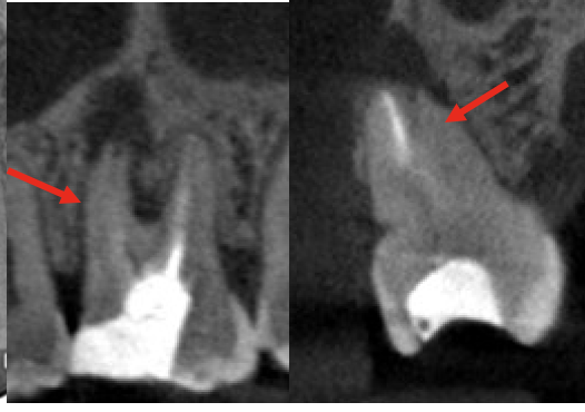 術前のCBCT画像、右上6の近心頬側根に透過像(炎症の黒い影)と未処置の根管MB2(赤色矢印)が見られ腫れている原因となっていることがわかる。