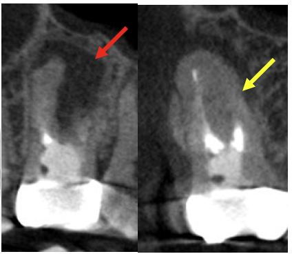 歯根端切除前と術後半年のCBCT画像、感染源を除去してしっかり封鎖したことで、骨の再生を認め治癒が確認されました(黄色矢印)。