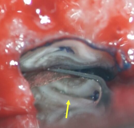 もう少し歯根を切断すると、イスムス(黄色矢印)が出てきました。感染源です。